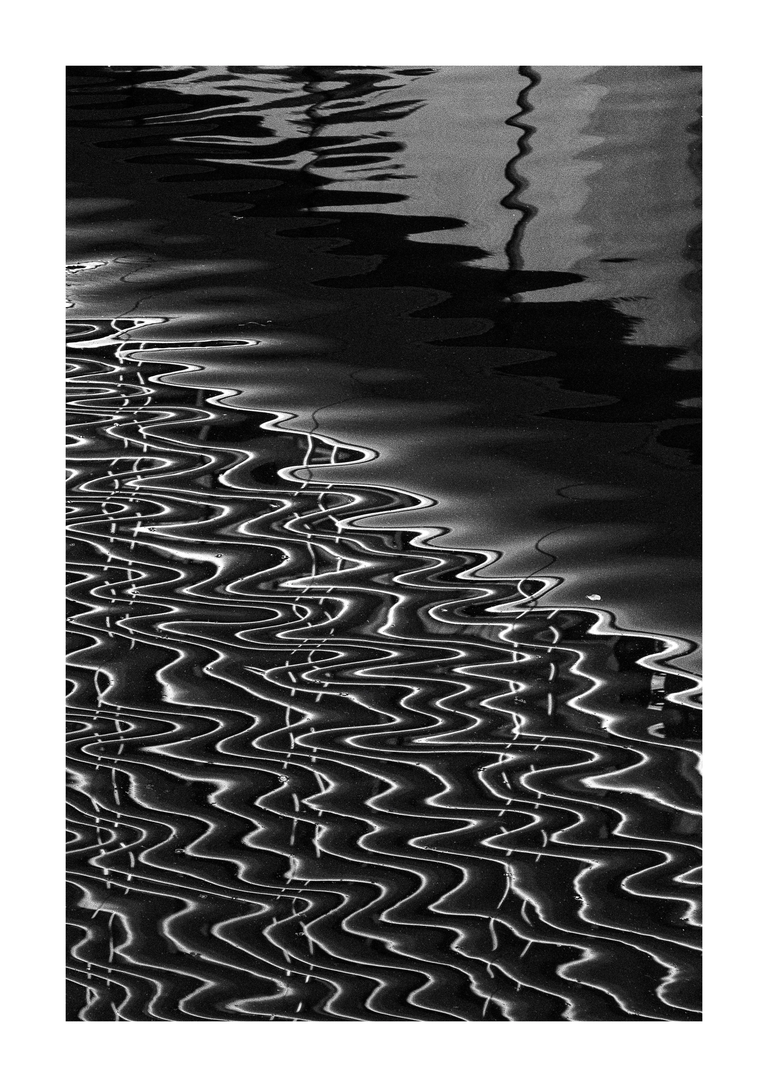 An abstract black and white snapshot from my second canal reflections set. Contrasting lines weave diagonally across the water surface creating mesmerising effect.